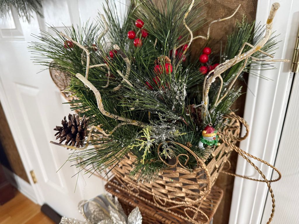 This gold sleigh is filled with evergreens, berries, pine cones and twigs.