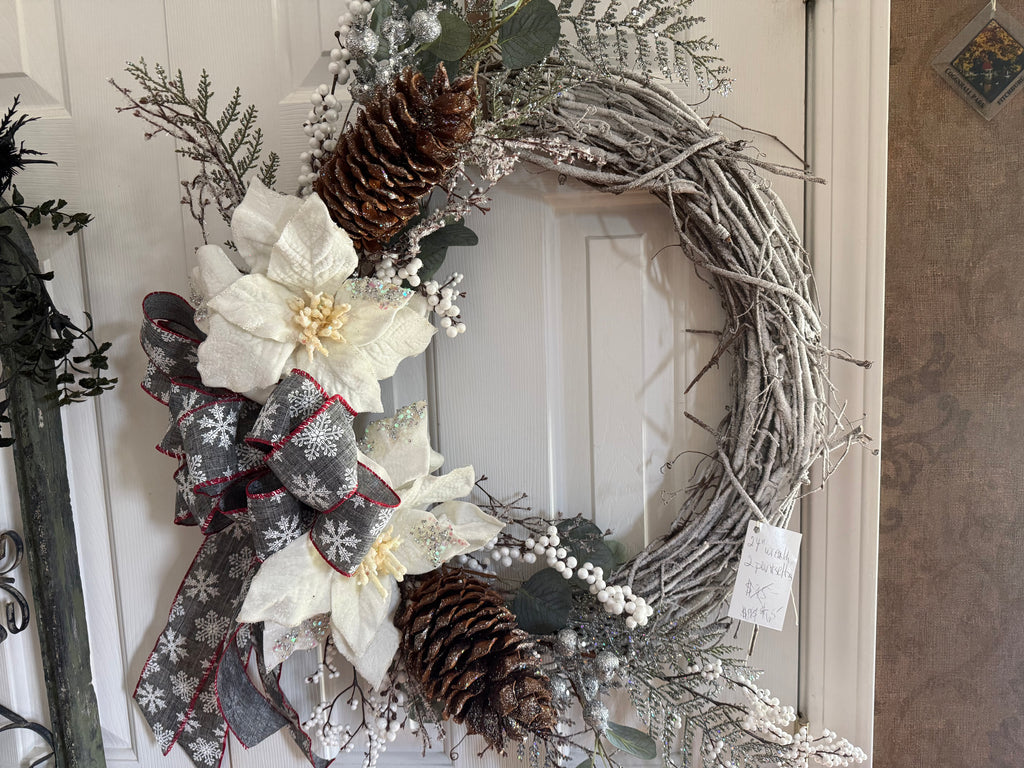 This is a snow covered 24” grapevine wreath with two gorgeous velvet poinsettias, pinecones, berries and more. Stunning grey and white snowflake bow