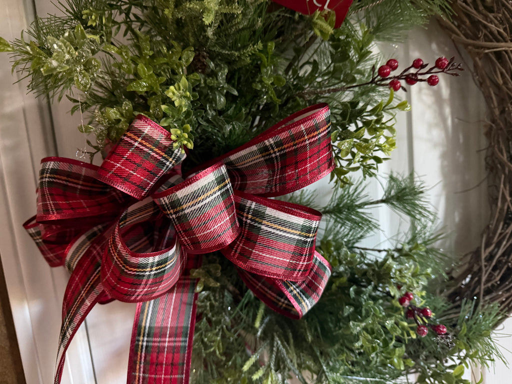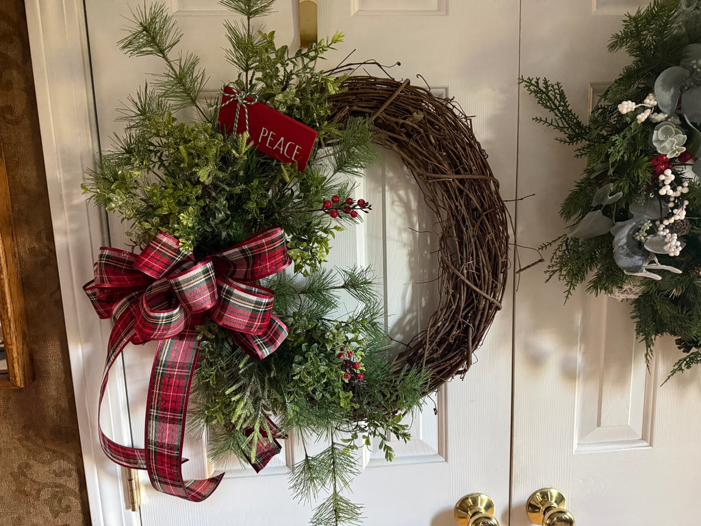 This grapevine wreath is filled with various greenery, and berries. A Peace sign is added along with a plaid bow.
