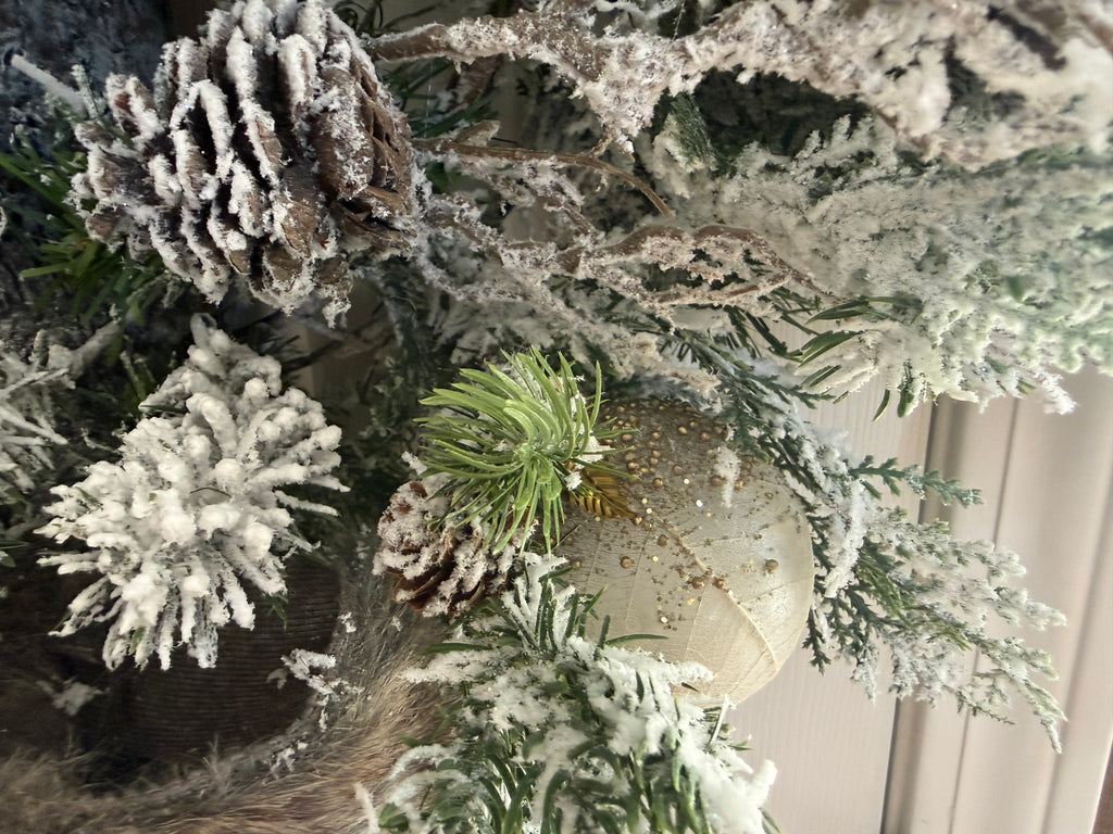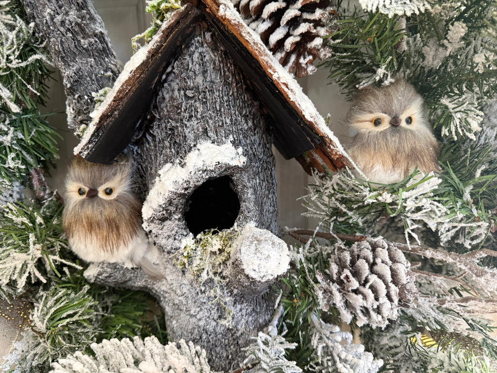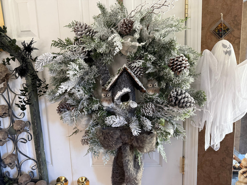 this evergreen wreath is 24 inches wide. It is snow covered with a handcrafted tree trunk and two baby owls. Lots of pinecones and ornaments and twigs fill this gorgeous wreath. You can use it all winter long. It also has a fur bow.