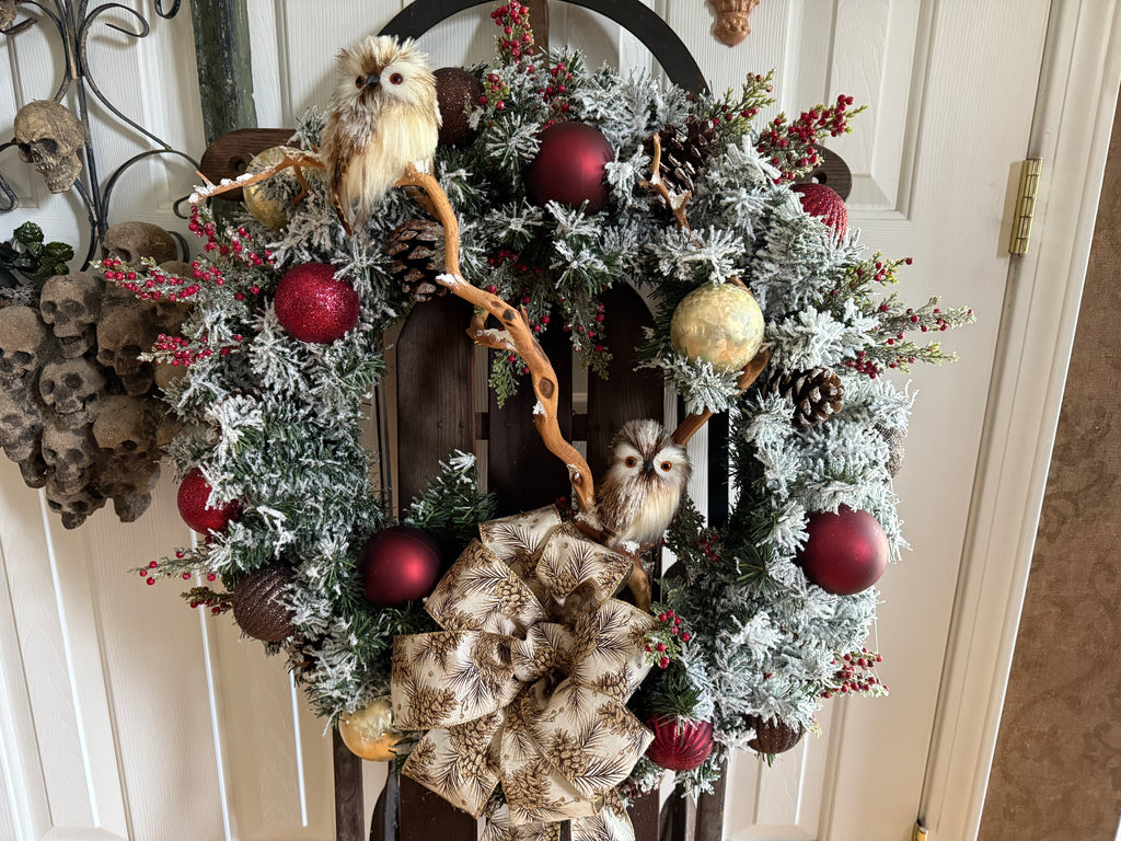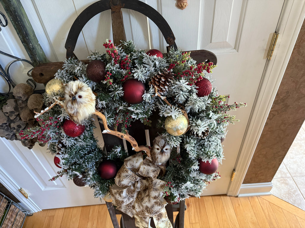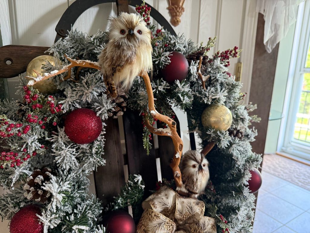 Four feet tall. This vintage sled is decorated with snowman, two baby owls pine cones, ornaments and a gorgeous bow.