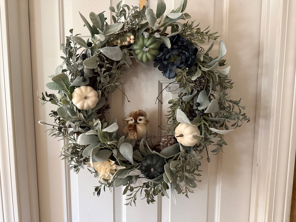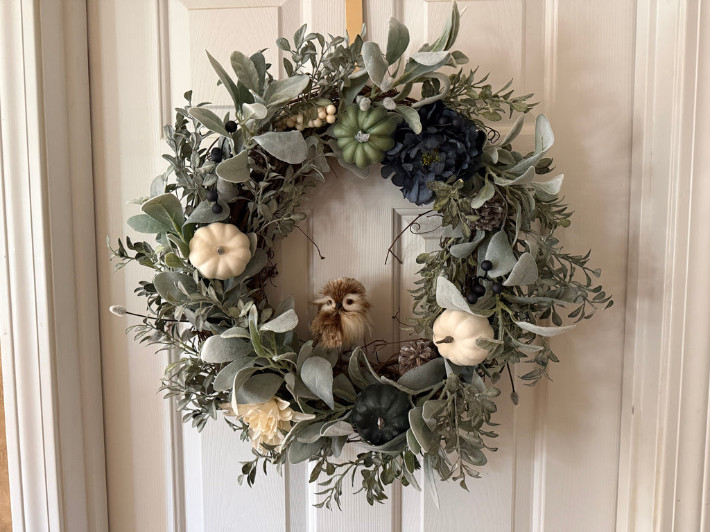 This grapevine wreath is filled with lambs, ear, and other greenery. It has berries and flowers and pumpkins. The baby owl sits in the middle of the wreath.