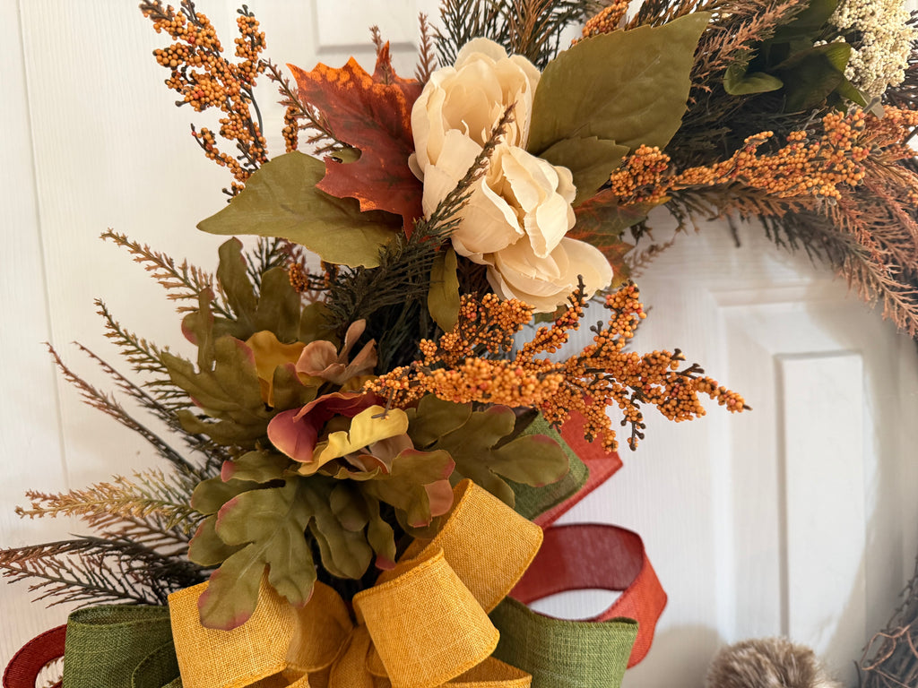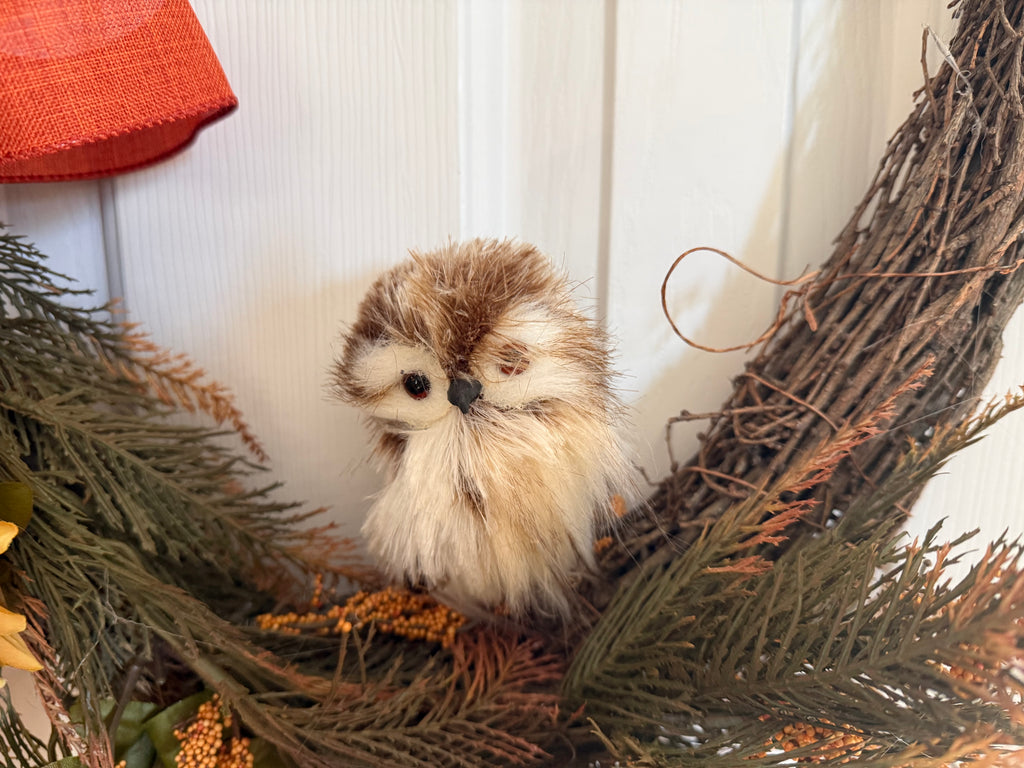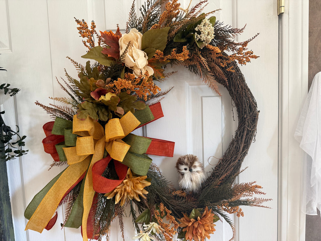 This Grapevine wreath is filled with fall evergreens, fall flowers, and tiny berries. A triple bow and baby owl are added.