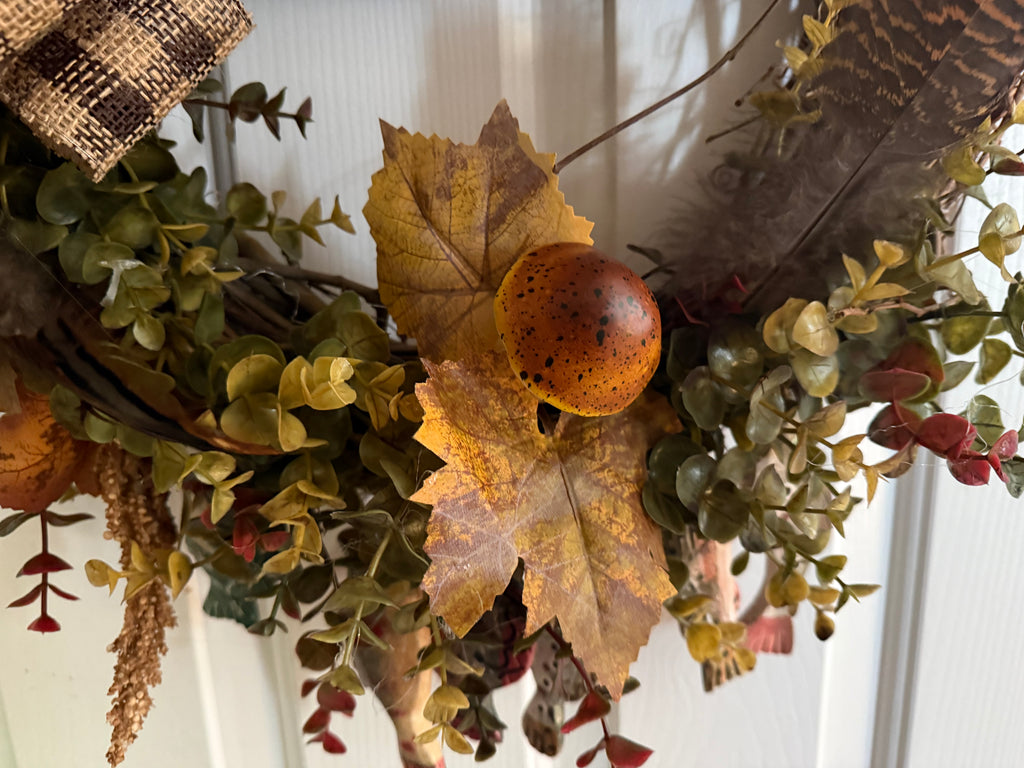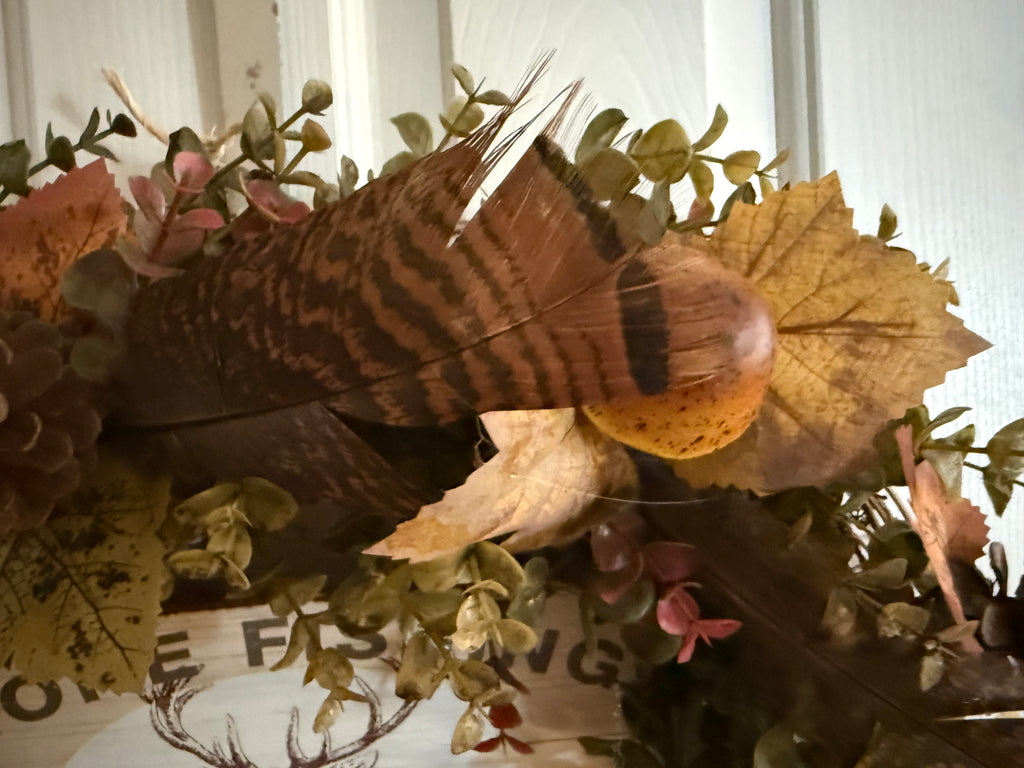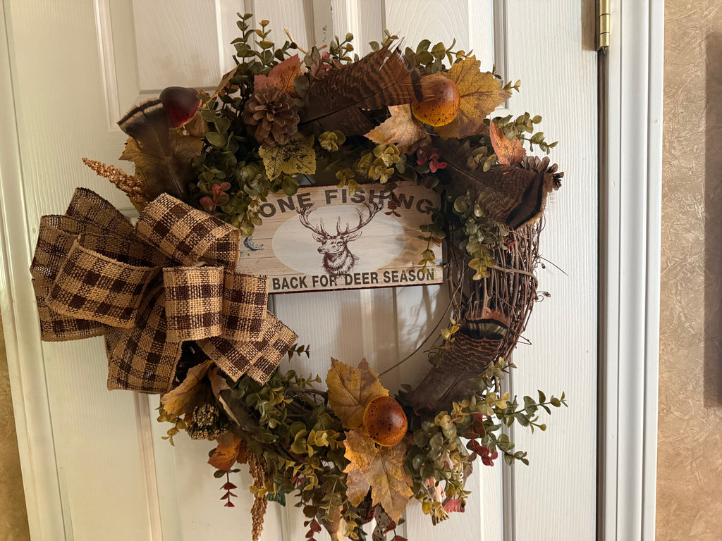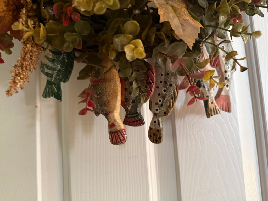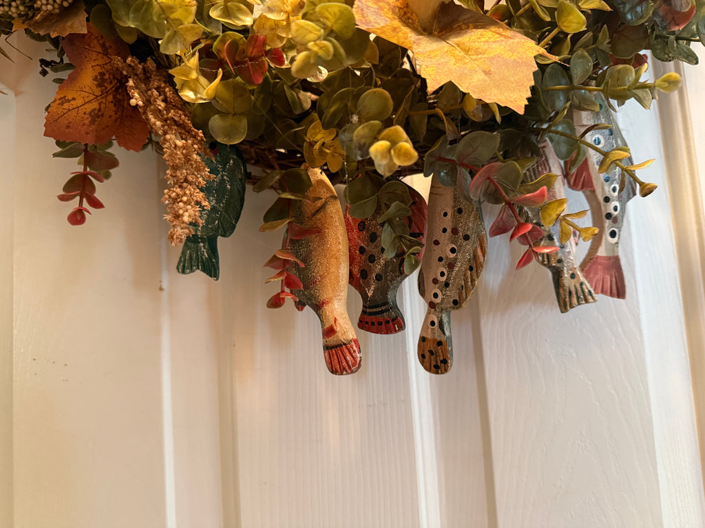 This grapevine wreath is filled with fall eucalyptus, woodsy, mushrooms, and leaves and pine cones. A sign sits in the middle gone fishing. Be back for deer season. Wooden fish hang on the bottom. A plaid bow is added for the final touch.