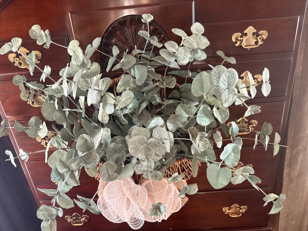 This vintage hanging basket is filled with beautiful eucalyptus and a bow. Simple but classic.