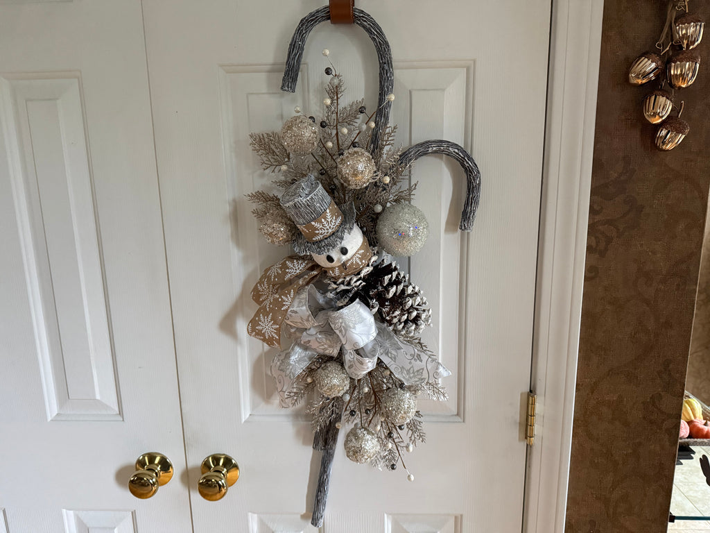 These candy canes are made to look like wood with a handcrafted snowman on a pine cone. Ornaments, berries and a bow are added