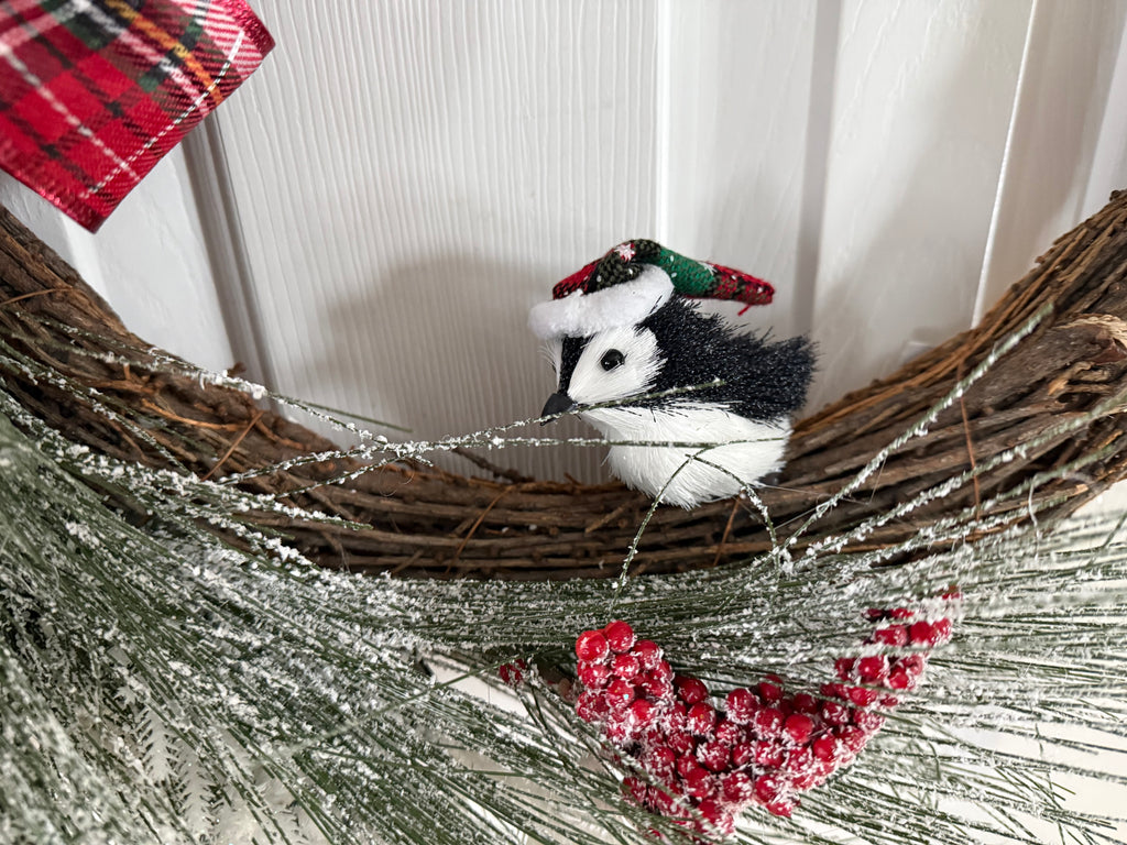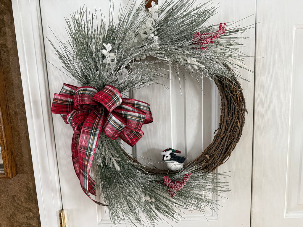 This Grapevine wreath is covered with Scotch pine evergreens, a few berries, a plaid bow in a little penguin