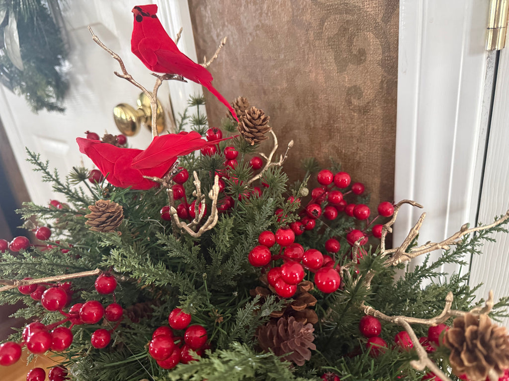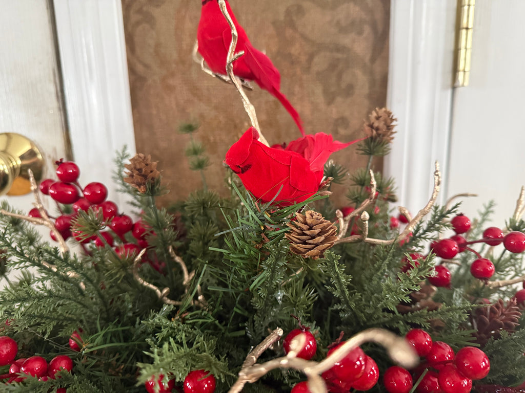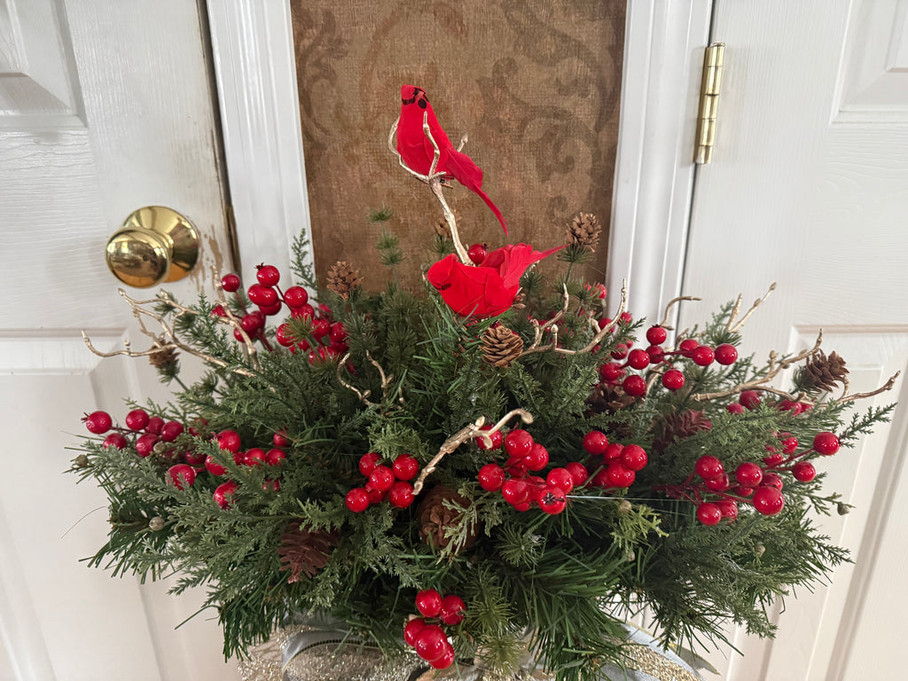 This centerpiece is filled with various evergreens, pine cones, red berries and two cardinals on the twigs.