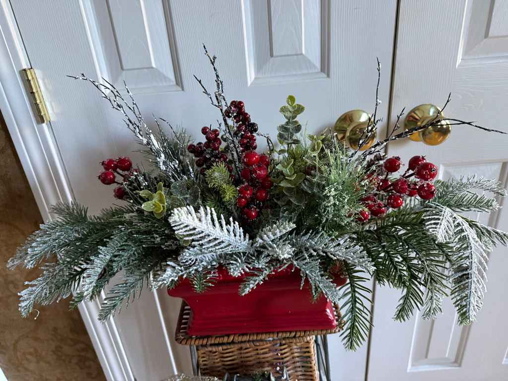 This ceramic container was hand painted and filled with snow covered evergreens, berried, sticks and pine cones.
