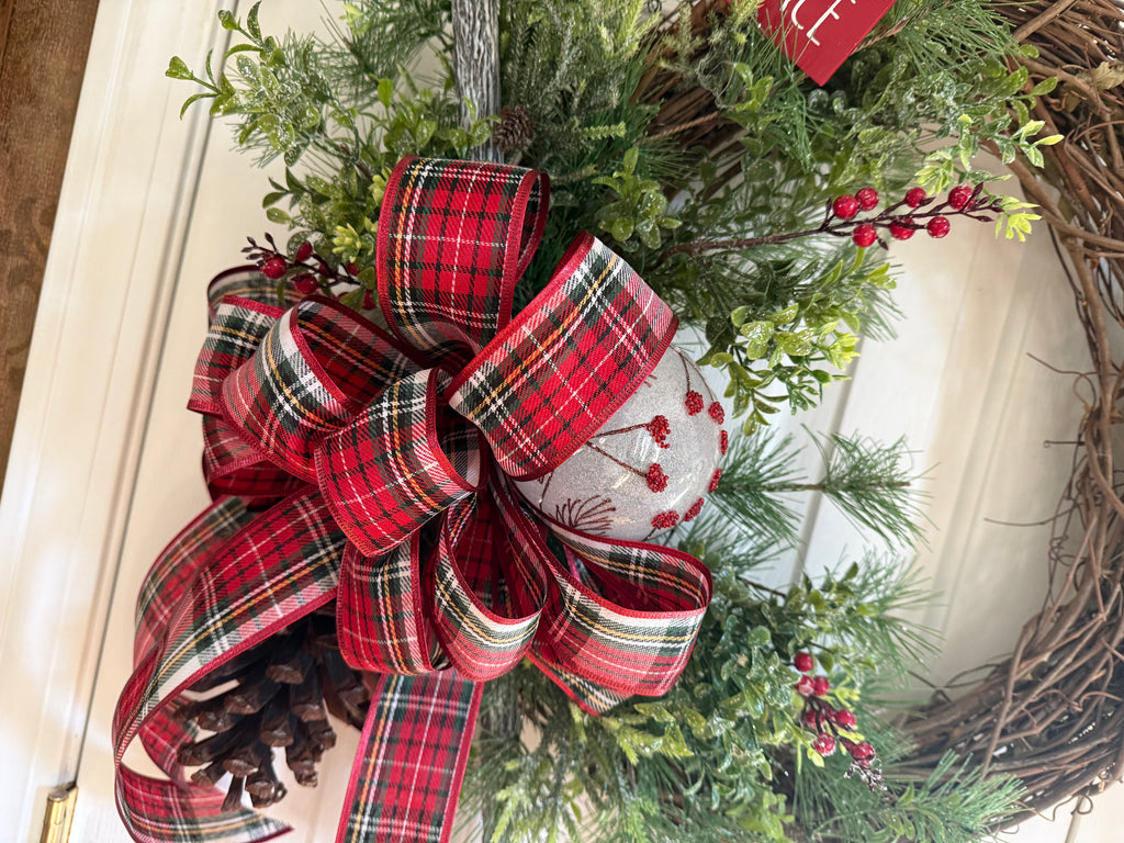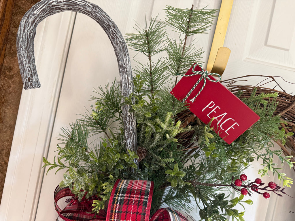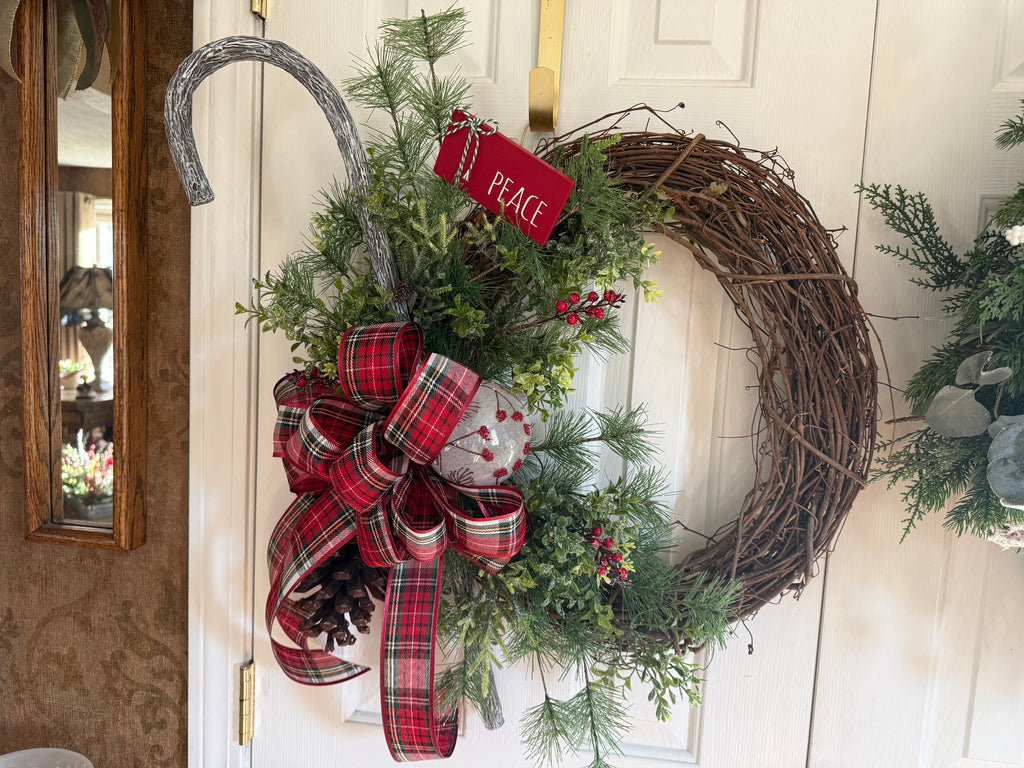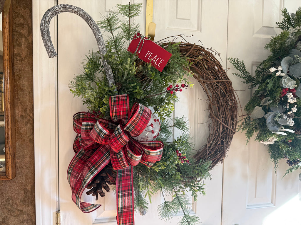 This grapevine wreath is filled with various greenery, and berries. A Peace sign is added along with a plaid bow, ornament, pine cone and a wooden candy cane.