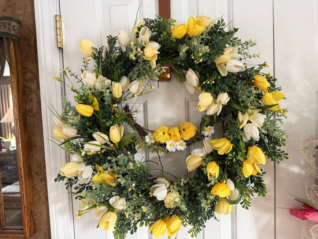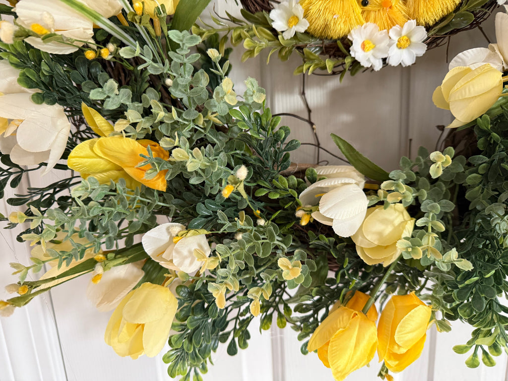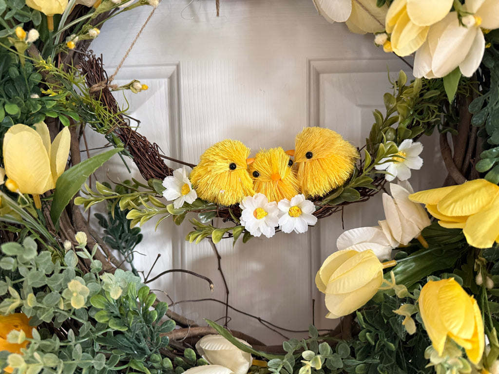 This grapevine wreath is filled with various colors of greenery, berries, and tulips. Three baby chicks are swinging in the middle